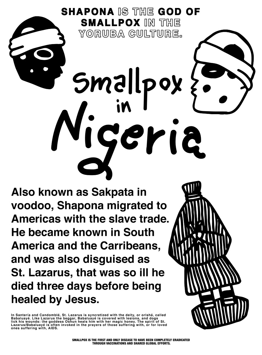 The project "The Smallpoxed Perspective" aims to express the influence of Smallpox - a disease that affected humanity globally but also the first disease to have been completely eradicated through global efforts and vaccinations. The project consists of five illustrated posters that detail the effect that Smallpox had on several cultures in Egypt, China, India, Nigeria and the Americas.