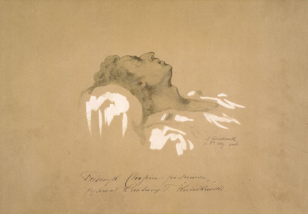 Chopin is laying in his bed in Paris on the evening of October 16th, weak and with almost no sign of life. Only close friends and family are there with him. At the request of Chopin, his friend are providing music, Potocka sang and Franchomme played the cello. Then after midnight his physician leaned over him and asked whether he was suffering greatly. “No longer “ he replied. He died a few minutes before two a clock in the morning. His heart was removed and was put on hard water.